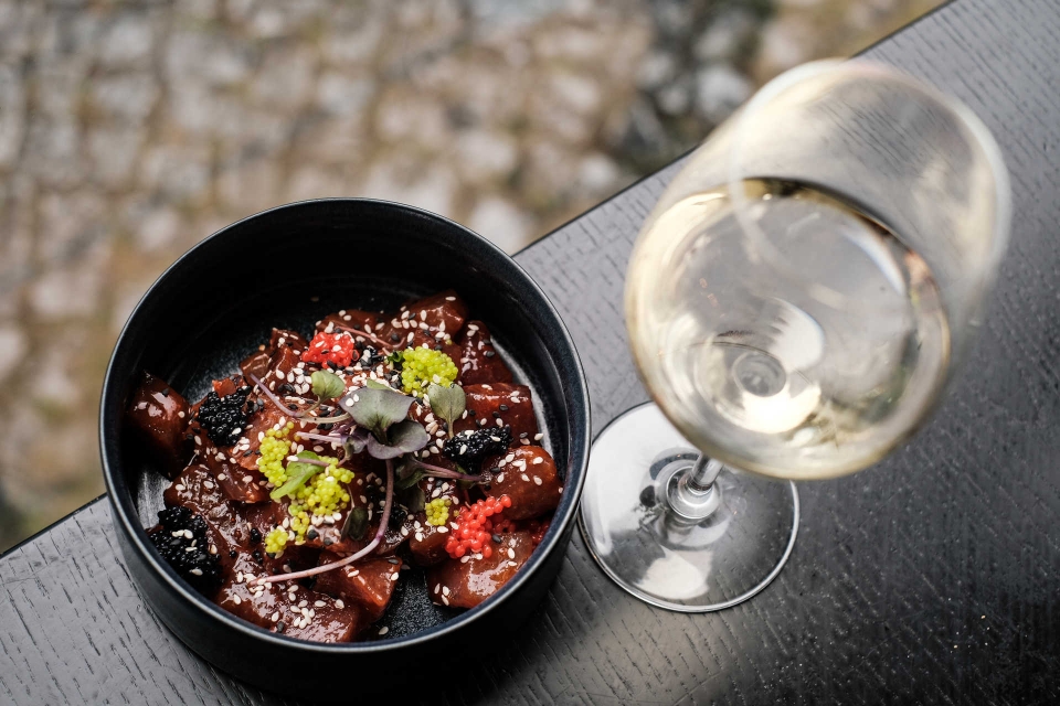 O rés-do-chão e o primeiro andar da Esplanada do Jardim estão agora por sua conta. Almoçamos no rés-do-chão, um restaurante com capacidade para uma 100 pessoas, a juntar a outro tanto na esplanada. As entradas deixam adivinhar que o chef Rafael Santos, em parceria com Martim Nunes e Gabriel Frank, é capaz de surpreender sem esforço: um donut de camembert panado, em fatias de bacon, antes de um pica-pau com mostarda de Dijon e pickles. Depois, um kimuchi à base de ovas de peixe e leite de tigre, guarnecido com sementes de sésamo. Por ali, há sempre pratos do dia e por isso é imperdível experimentar as duas sugestões deste dia soalheiro, que casa bem com choco frito acompanhado com puré de batata-doce e gratinado de brócolos.