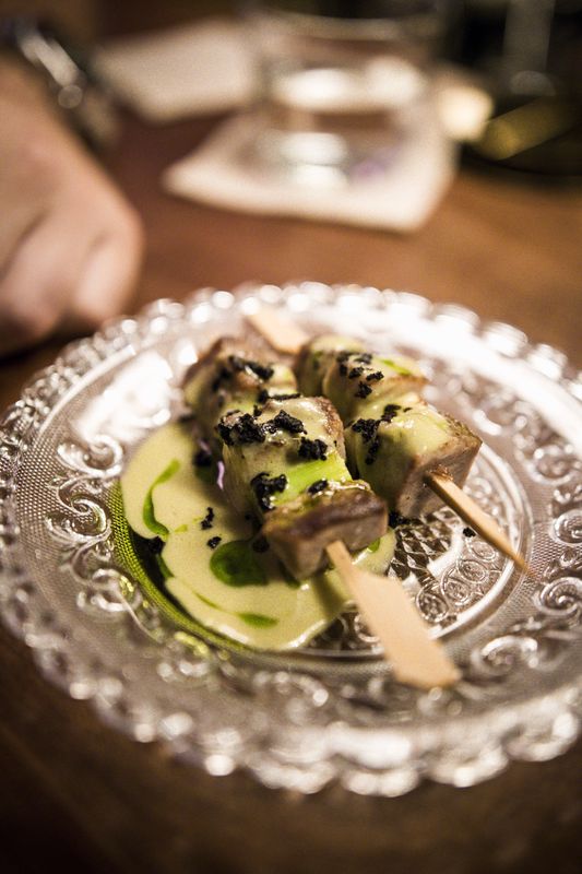 Servindo-se de referências a Mr. Bean, Os Marretas ou Star Wars, entre outros ícones pop, também os petiscos do chef Guilherme Spalk, propositadamente em inglês, pretendem ser desbloqueadores de conversa. Sanduíche com camarão picado e maionese de ovas de salmão; pastel de massa tenra recheado com caldeirada; e coscorão recheado com pasta de peixe coberto de sementes de paprika queimada são três das ideias para comer à mão. “É comida descomprometida. O nosso dever é explicar ao cliente o modo como é feito”, diz.