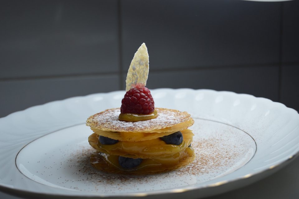 O mil folhas leva várias folhas de massa crocante recheadas com creme do Pudim do Abade, e esse é feito “tal e qual o original (apenas com um ponto de açúcar mais baixo), com os mesmos aromáticos e modo de confeção”, acrescenta Miguel Oliveira. Nesta receita, o doce leva também mirtilos (que lhe dão frescura) e uma framboesa no topo, que lhe confere alguma acidez.