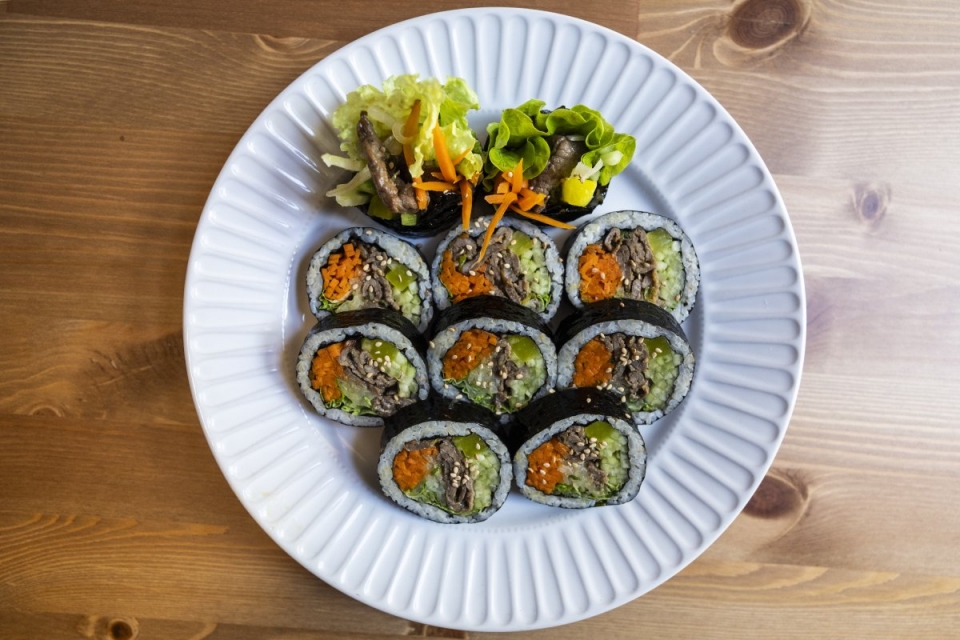 Entre as sugestões com mais saída conta-se o bibimbap, que mistura arroz com elementos tão diversos como cenoura, cebola, cogumelos, rabanetes, ovo ou porco (ou carne bovina, ou tofu), conta Yi Ryoung Jung. Quanto ao kimbap, que dá nome à casa, em Portugal tende a ser pedido como entrada, para partilhar, embora funcione como prato principal. E pode ser uma estratégia – usada por muitas mães coreanas – para fazer os miúdos comer vegetais, remata ela, com um sorriso.
