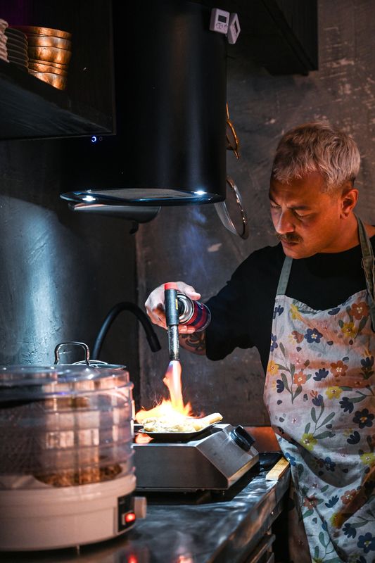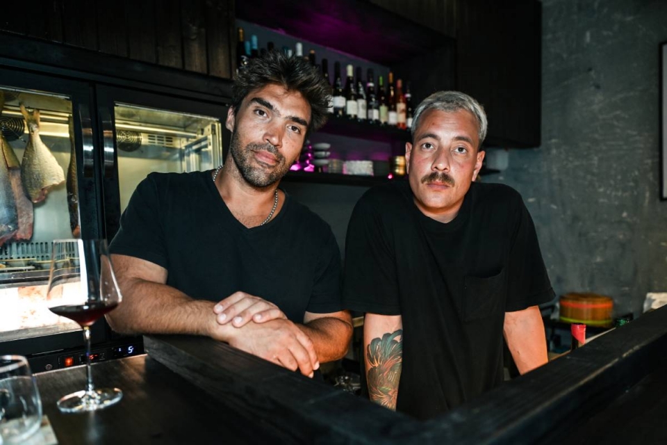 O termo indígena da família linguística Tupi Guarani significa “amizade” e parece assentar que nem uma luva à dupla de Pedros, desde que se conheceram há três anos e meio e trabalham juntos desde 2022. O elo nasceu no Salta, restaurante de cozinha asiática e latino-americana que Pedro Lopes, 37 anos, abriu com três amigos perto do Marquês de Pombal. Pedro Binotti aplica o conhecimento de culinária tradicional japonesa e o que aprendeu com Miguel Bértolo, ao nível das técnicas de corte, após ter preterido a realização publicitária em favor da cozinha.