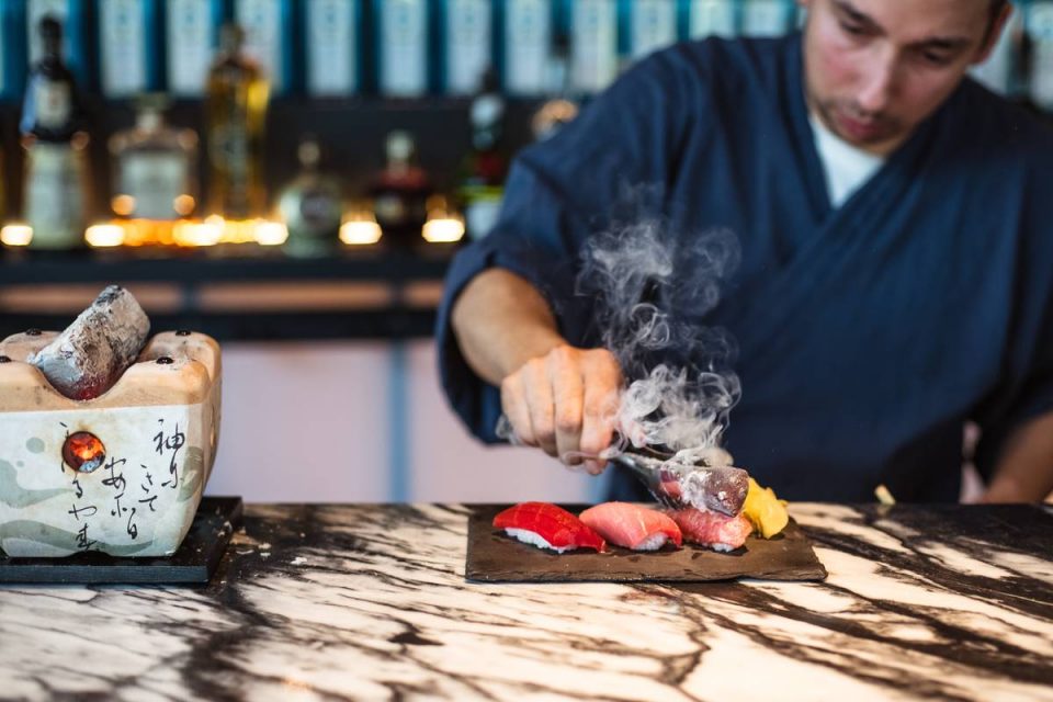Noutros pontos do menu, Lucas Azevedo utiliza ostras da Ria Formosa (temperadas), robalo e carapau de Peniche e ouriço-do-mar da Galiza, sendo que as espécies variam consoante as épocas. E por respeito à tradição japonesa, não há soja onde molhar as peças, pois já são temperadas e acompanhadas de gengibre e wasabi fresco, ralado no momento. A ideia é fazer tudo ali, desde a maturação do atum a usar o binchotan (carvão japonês) para selar o peixe e aquecer as algas dos temakis, que o chef faz em três versões, incluindo caviar e ouriço. Quem não for adepto de sushi, tem saladas e tapas por onde escolher, sempre aos almoços, na barra do restaurante.