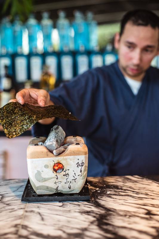 Lucas Azevedo, natural do Rio de Janeiro, chefiou o Bonsai – histórico restaurante japonês de Lisboa e um dos primeiros no país – até 2014. Depois, rumou para o Japão em busca de crescimento pessoal e profissional. “Inicialmente era para fazer um retiro espiritual, num templo budista, mas só podia ficar lá se fosse no mínimo dois anos”, conta, enquanto prepara um menu de sushi na barra do Praia no Parque. Acabou por ficar um mês e meio, tempo suficiente para estagiar num restaurante de sushi em Osaka e para passar por Tóquio e Koyasan, onde se ergue um importante templo budista. Quando voltou, tomou conta de um restaurante temporário, que deu que falar no Izakaya Tokkuri, em Campo de Ourique. Há pouco mais de um mês, assumiu a convidativa barra de sushi e crus do Praia no Parque – essa sim, definitiva.