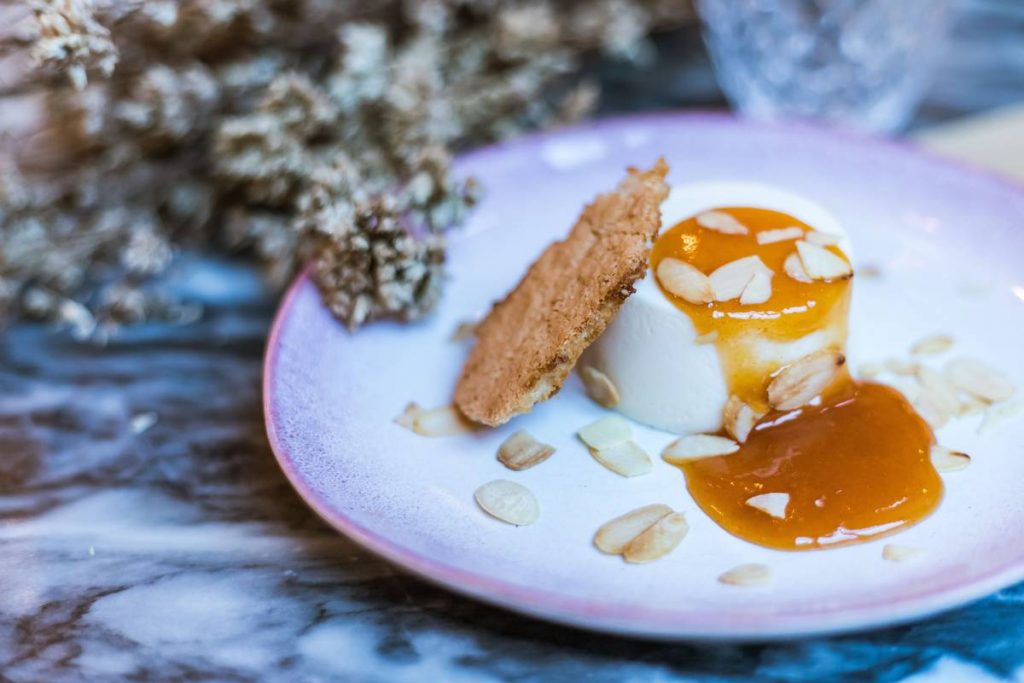 Na elaboração da pizza – composta por molho de tomate picante, queijo scarmoza, pancetta, agrião e marmelo – o chef decidiu destacar o agrião, “que simboliza as folhas caídas do outono”, e adicionou novamente marmelo, cortado às fatias. O ato final do menu surge em forma de cheesecake de ricotta com doce de diospiro (em vez do tradicional de morango) e amêndoa.