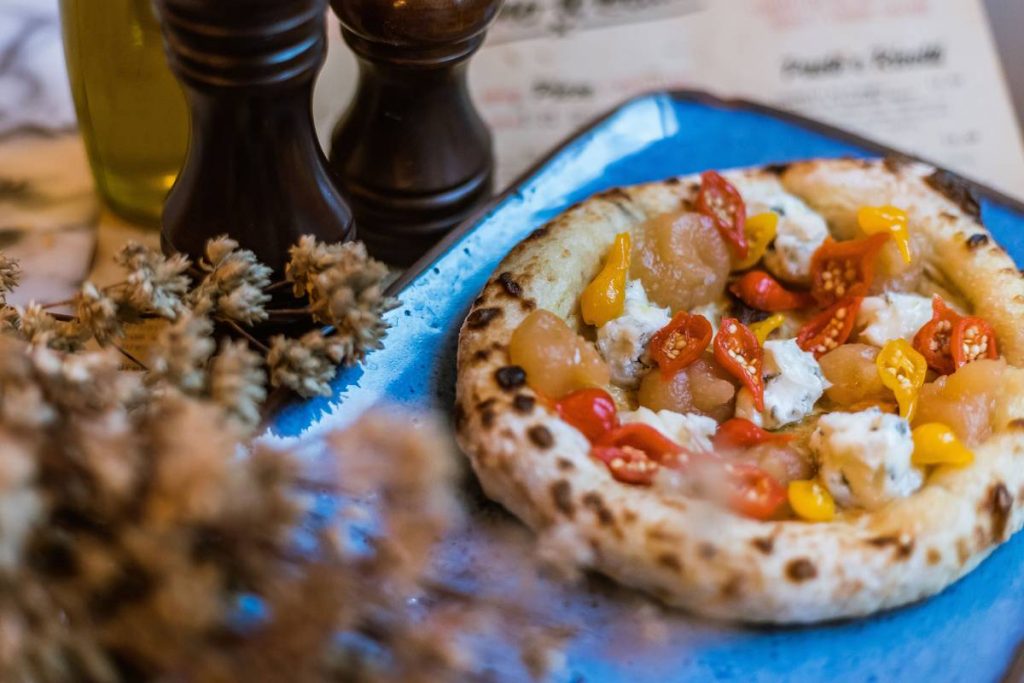 - Focaccia com gorgonzola, marmelada e pepperoncinos.