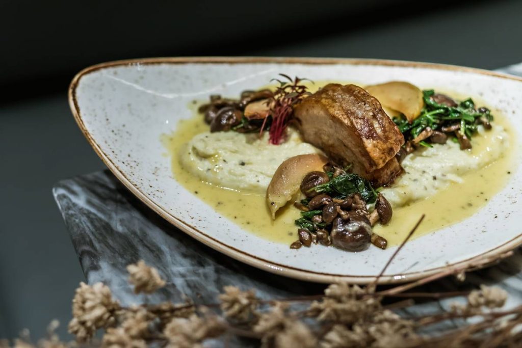 - Pancetta assada no forno, puré de batata, cogumelos, marmelo e castanhas.
