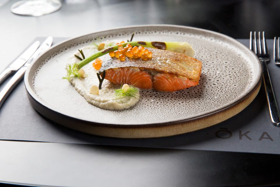 Para comer sozinho – “ou não”, como sugere Okah – destacam-se dois pratos que nos levam às águas frias do Alasca: salmão selvagem com puré de funcho e bacalhau negro com curgete, cenoura, beringela e pack choi. “Somos o primeiro restaurante em Lisboa a vender salmão selvagem do Alasca, de pesca sustentável”, realça Estela Lima, diretora de operações do Okah Restaurante & Rooftop. Nas carnes, menção para o tenro tataki de novilho.