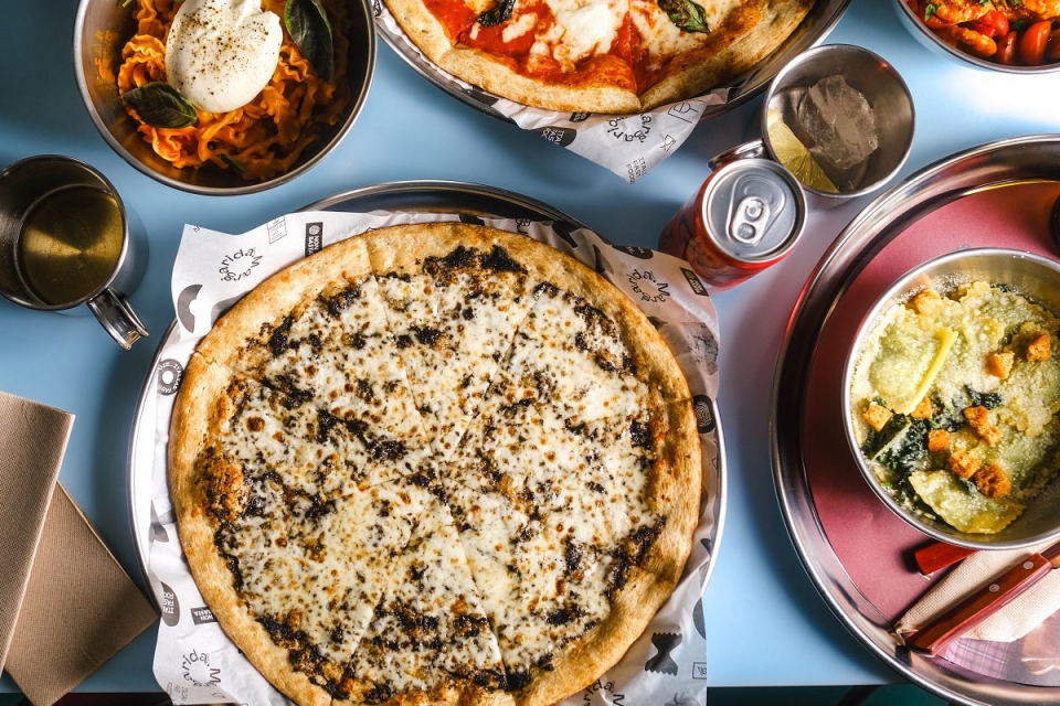 Na carta, coabitam 12 pizas, da clássica Margherita DOP (9,90€) a outras como a Pasta Non Basta (tomate, mozarela, cogumelos frescos, guanciale, cebola roxa, azeitonas e pimenta preta, 11,90€) e a Tartufo (mozarela, mascarpone, parmesão e salsa trufada, 12,90€). A estas juntam-se as massas, como a trecce all’amatriciana (molho de tomate, mozarela de búfala e picles de malagueta, 12,90€) e os gnoccheti sardi al pesto (massa típica da Sardenha com pesto, pepino, tomate, pimentos marinados e lascas de parmesão, 10,90€). A completar o ramalhete há ravioli, burratas, saladas, cinco tipos de focaccia diferentes e três sabores de gelados artesanais – morango e manjericão, nutella e fiordilatte.