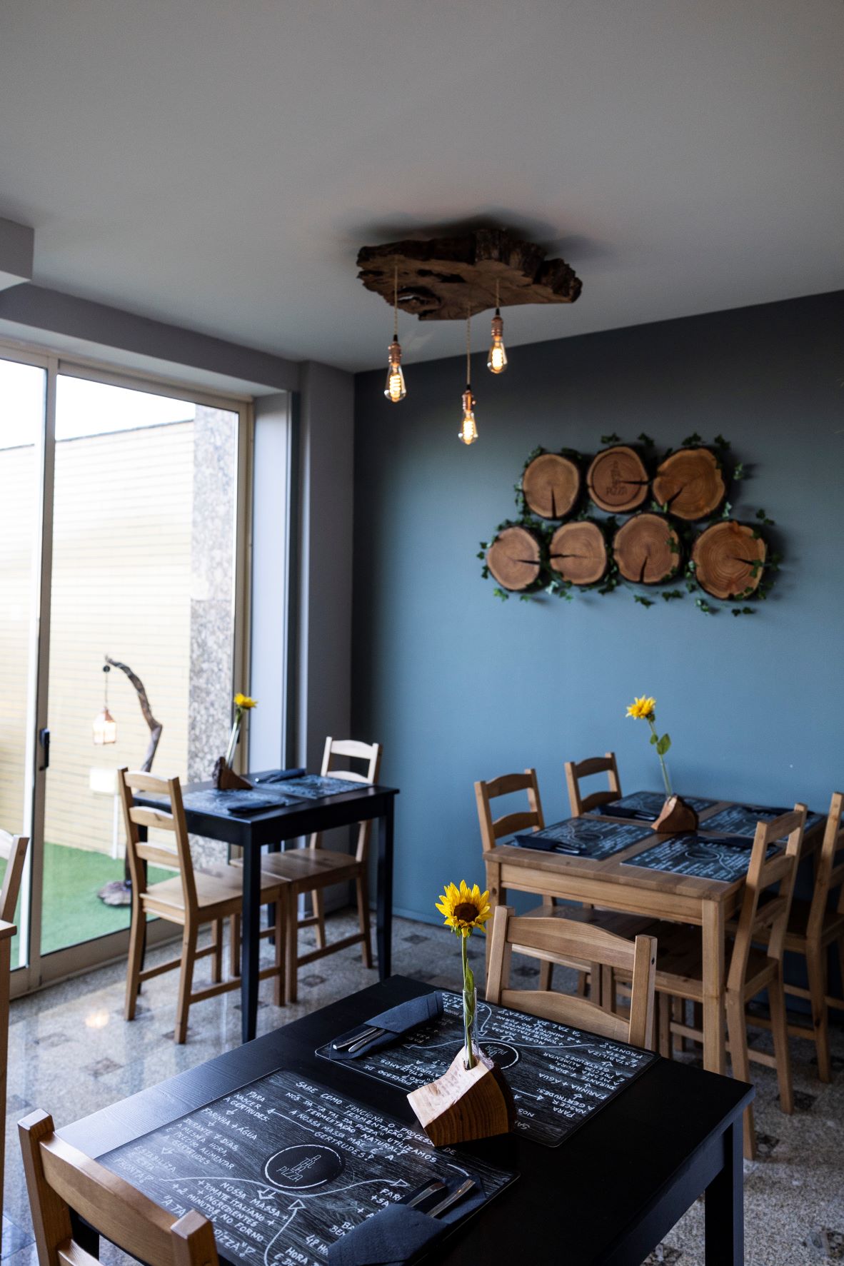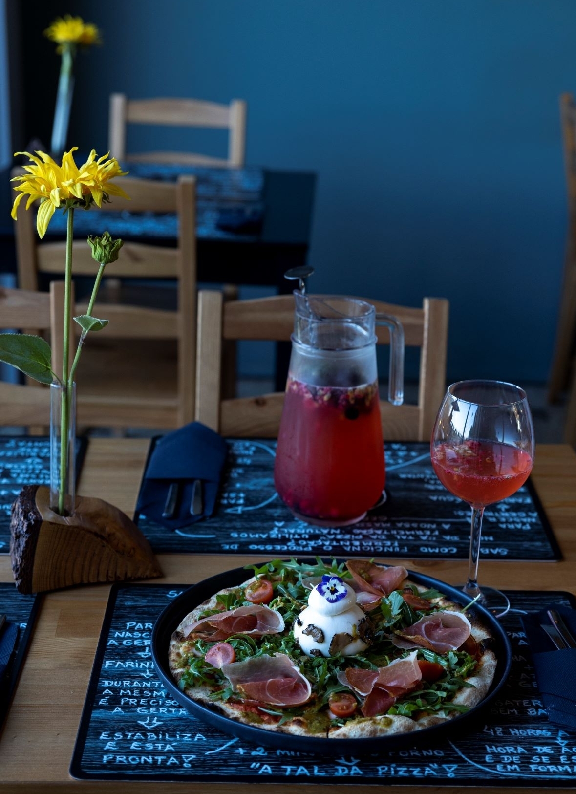 Tiago aprendeu a arte a trabalhar num restaurante italiano em Barcelona, com um mestre napolitano. Quando regressou a Portugal, teve outras ocupações, mas a “saudade de fazer pizas”, juntou-se à vontade de abrir um negócio seu e fez nascer este espaço, onde o casal também explora a paixão pela arte: acolhem regularmente exposições de artistas locais, e Tiago é autor dos bonitos candeeiros e outras peças de decoração feitas a partir de pedaços de madeira recolhidos na natureza.