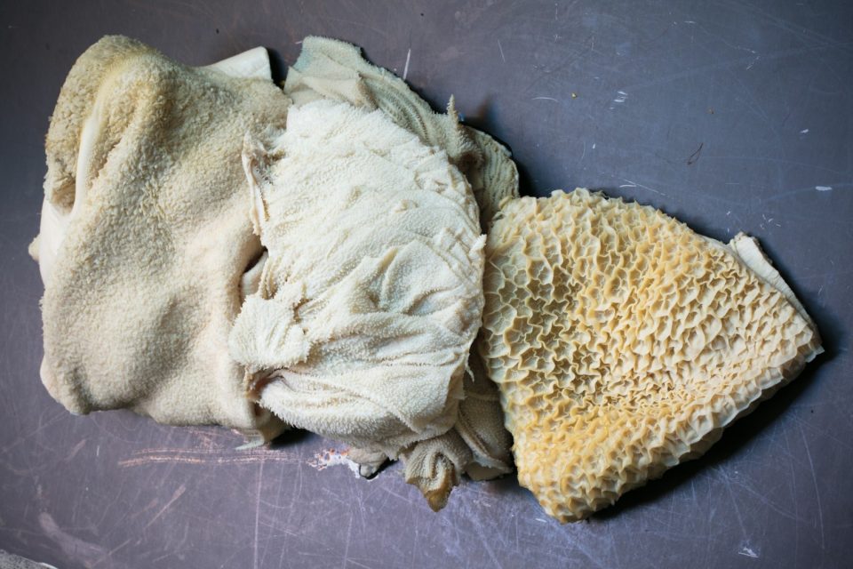 Quem conta um conto acrescenta um ponto e a tragédia do aviltamento da receita original segue o caminho de muitas outras. Chama-se tripas às quatro secções do estômago da vaca, ruminante por excelência cada uma com sua função. A pança é a primeira, lisinha, a segunda o barrete, identificável pela estrutura semelhante a favos de colmeia. Segue-se o folhoso, que faz jus ao nome pelos entrefolhos que apresenta, e finalmente o coagulador, fibroso, tipo amálgama de tendões.
