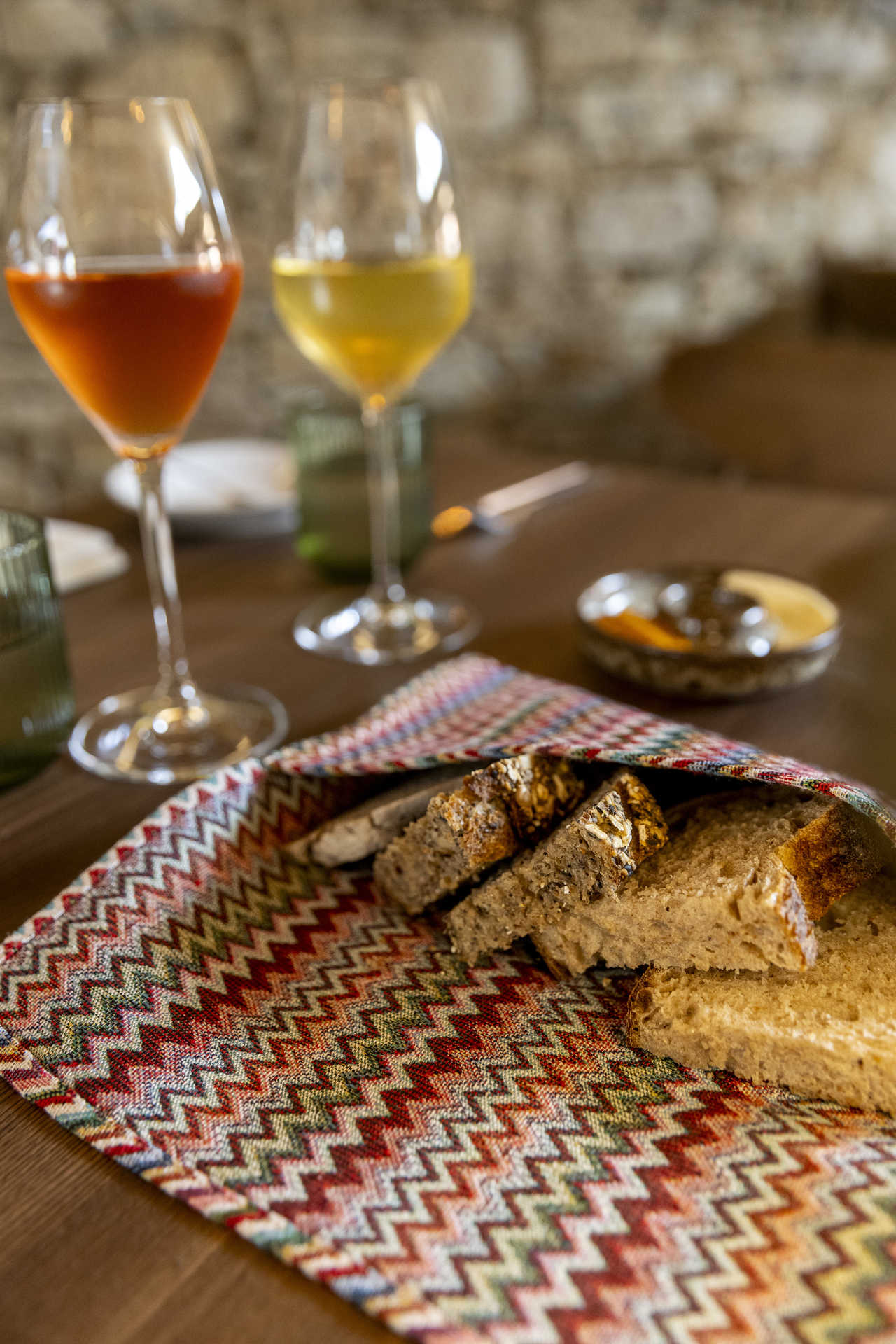 - Pão de fermentação lenta e uma seleção de vinhos. À direita, a espetada de lulas e chouriço. (Fotografia de Carlos Carneiro)