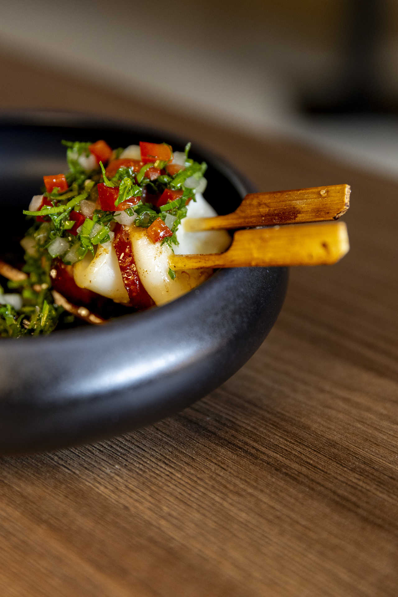 No Cibû, os sabores são tradicionais, as bases dos tachos coloridas e com um toque manual, mas a apresentação dos pratos é cuidada, e há surpresas. Isso fica claro logo com a chegada dos snacks, do pastel de beterraba ao bolo de arroz de gamba rosa, com o clássico rótulo de papel – Hugo Portela recorda-se de ir tomar o pequeno-almoço com o pai e pedir aquele bolo, que decidiu recriar em versão salgada.