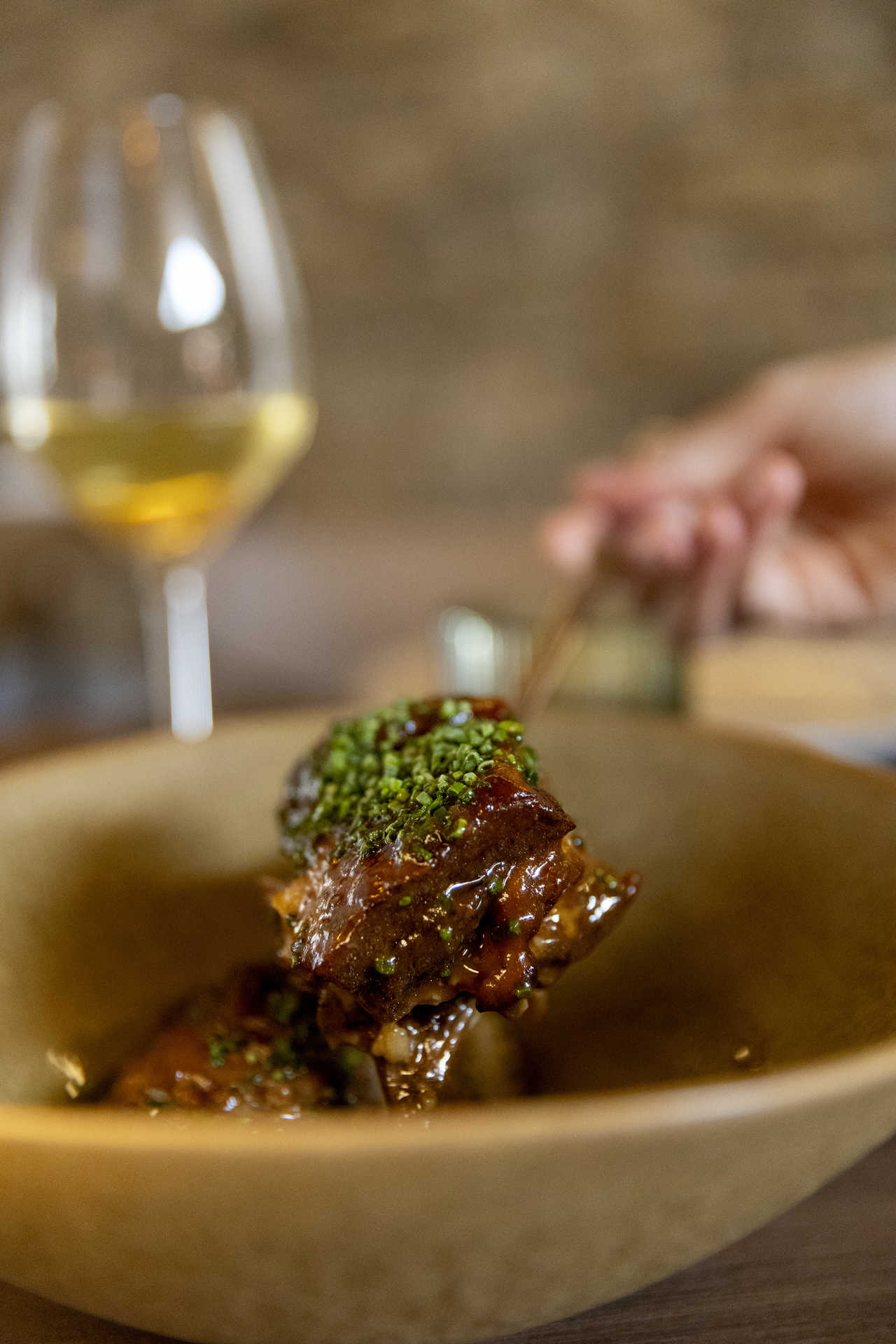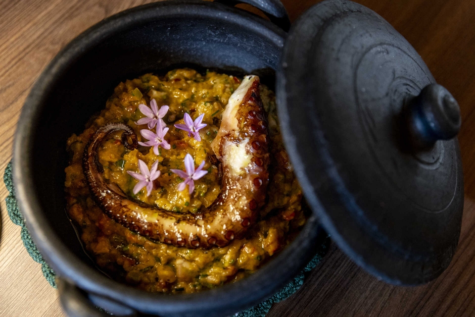 O que Hugo Portela ali pratica é “uma cozinha de memórias”, sustenta, dando como exemplo a açorda de polvo, que associa à mãe e à avó e é costume comer no Natal, em Trás-os-Montes. A sua receita, servida num tacho de barro preto de Bisalhães, conhece ligeiras alterações em relação à de família, até porque gosta de misturar peixe com carne e usa chouriço transmontano no refogado. Também a costela mindinha, que pode ter vários acompanhamentos (no caso, batata, cebola e papada de porco), traz à lembrança do chef os assados de domingo, que exigem longas marinadas e transmitem conforto.