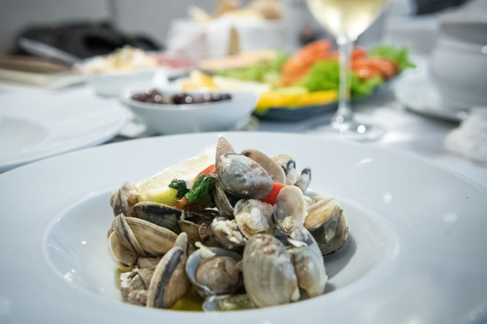 Ao longo dos anos foi havendo renovações e esta última surgiu “para acompanhar o mercado e para proporcionar mais conforto” aos clientes. “Era uma marisqueira tradicional, de muita rotação, com paredes em azulejo, chão em pedra, muito inox. As pessoas sentiam que era muito frio, muito escuro”, refere. Os tons bordeaux, os poucos candeeiros e as cadeiras de madeira deram lugar a uma parede azul mar, num degradé que acaba no branco das nuvens, a sofás e cadeiras almofadadas e a uma luz clara e difusa, “uma envolvência para que as pessoas se sintam mais em casa, numa sala de jantar”.