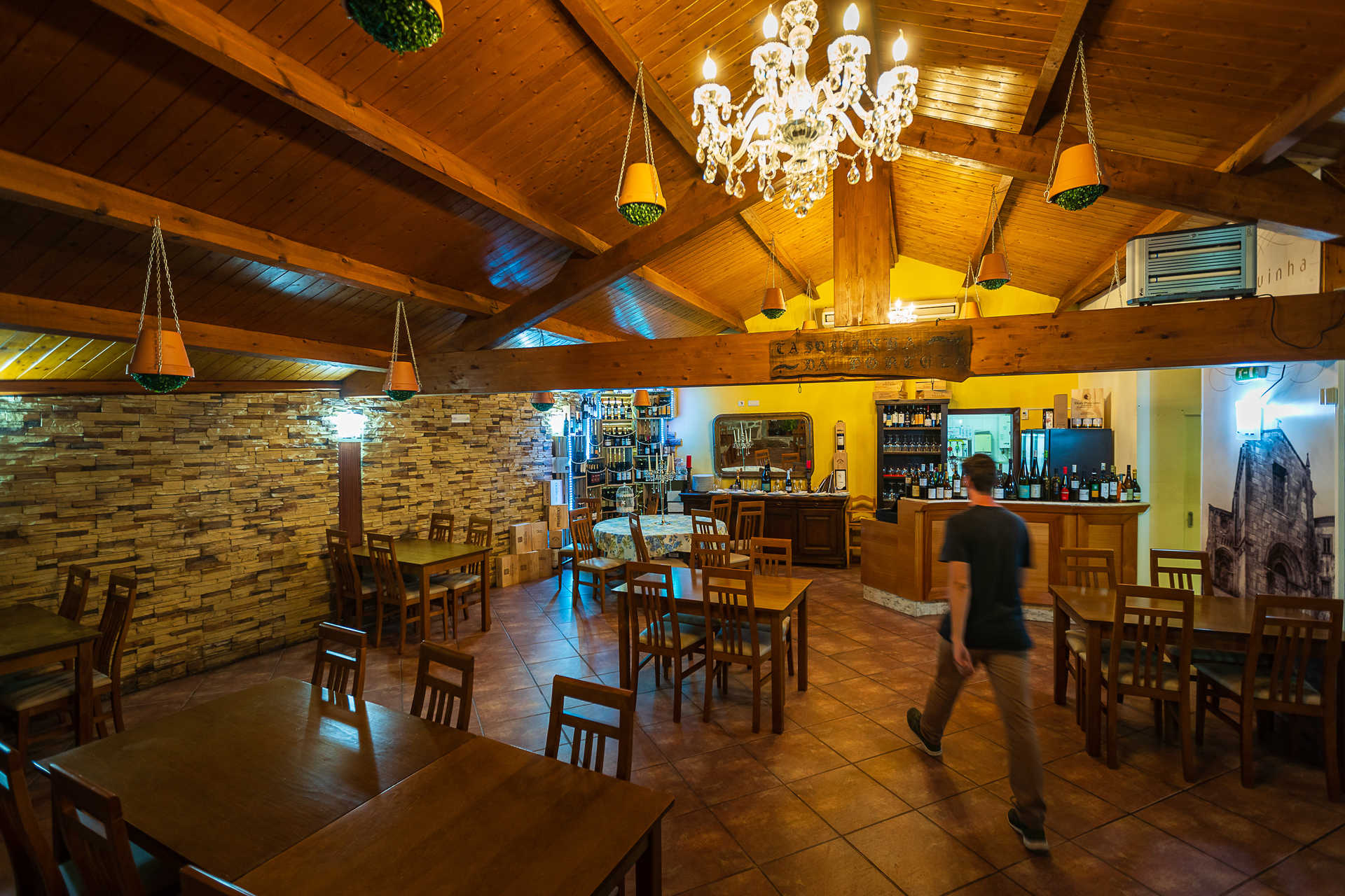 Vigas em madeira no teto e objetos de outros tempos compõem o ambiente rústico da Tasquinha da Portela. À decoração junta-se ainda um antigo espelho em cristal, original da casa.