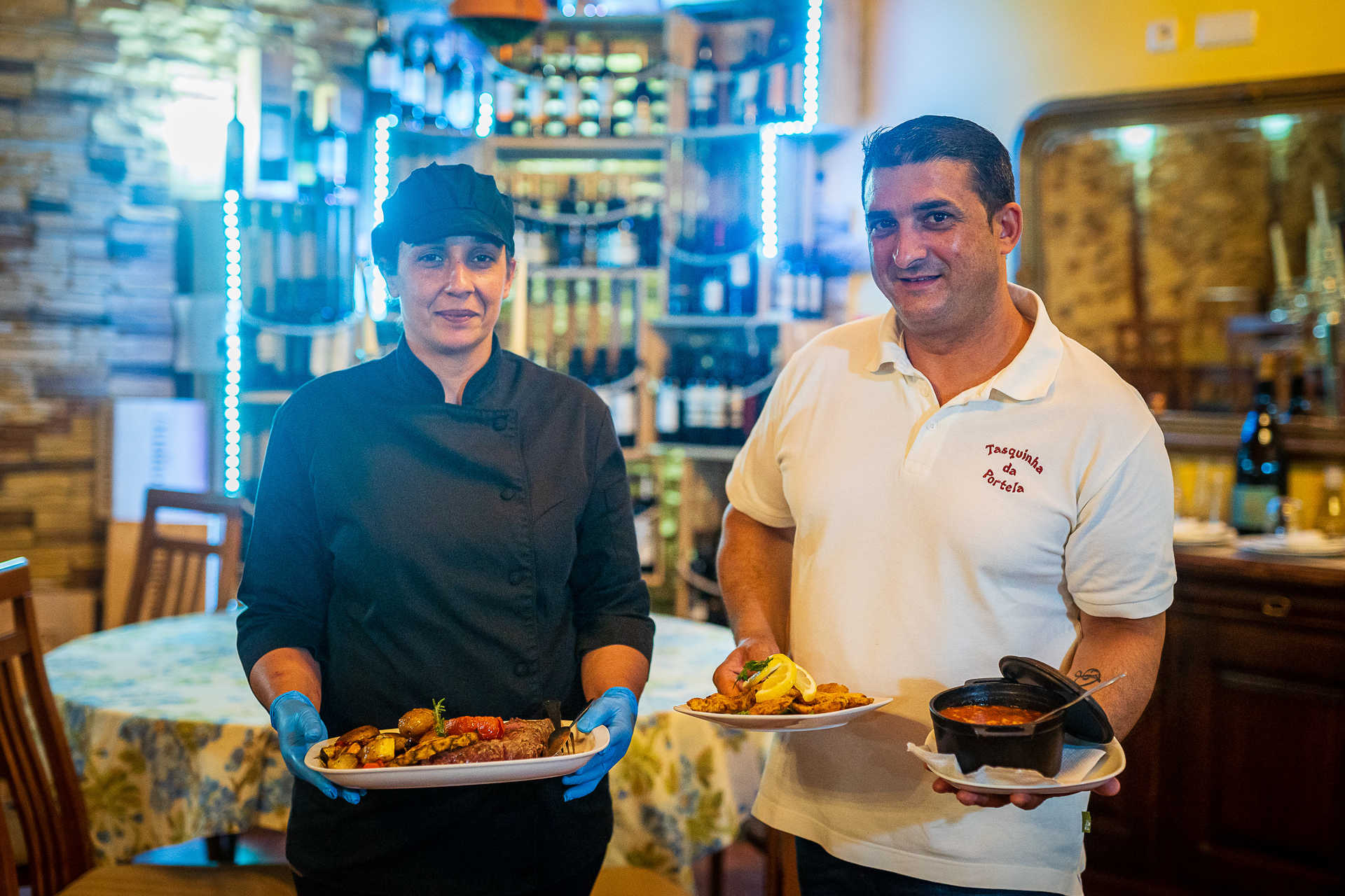 O restaurante está instalado num edifício que data de 1776 (como se vê inscrito numa das pedras na fachada), deixado de herança a Ana Luísa. Já antes tinha sido casa de negócio, mas esteve ao abandono durante quase 40 anos, até o casal fazer dela a morada da Tasquinha da Portela. “No início abrimos só mesmo com petiscos”, recorda Filipe, mas o negócio foi crescendo – o que levou à abertura de uma nova sala, e depois outra, e ainda um agradável terraço.