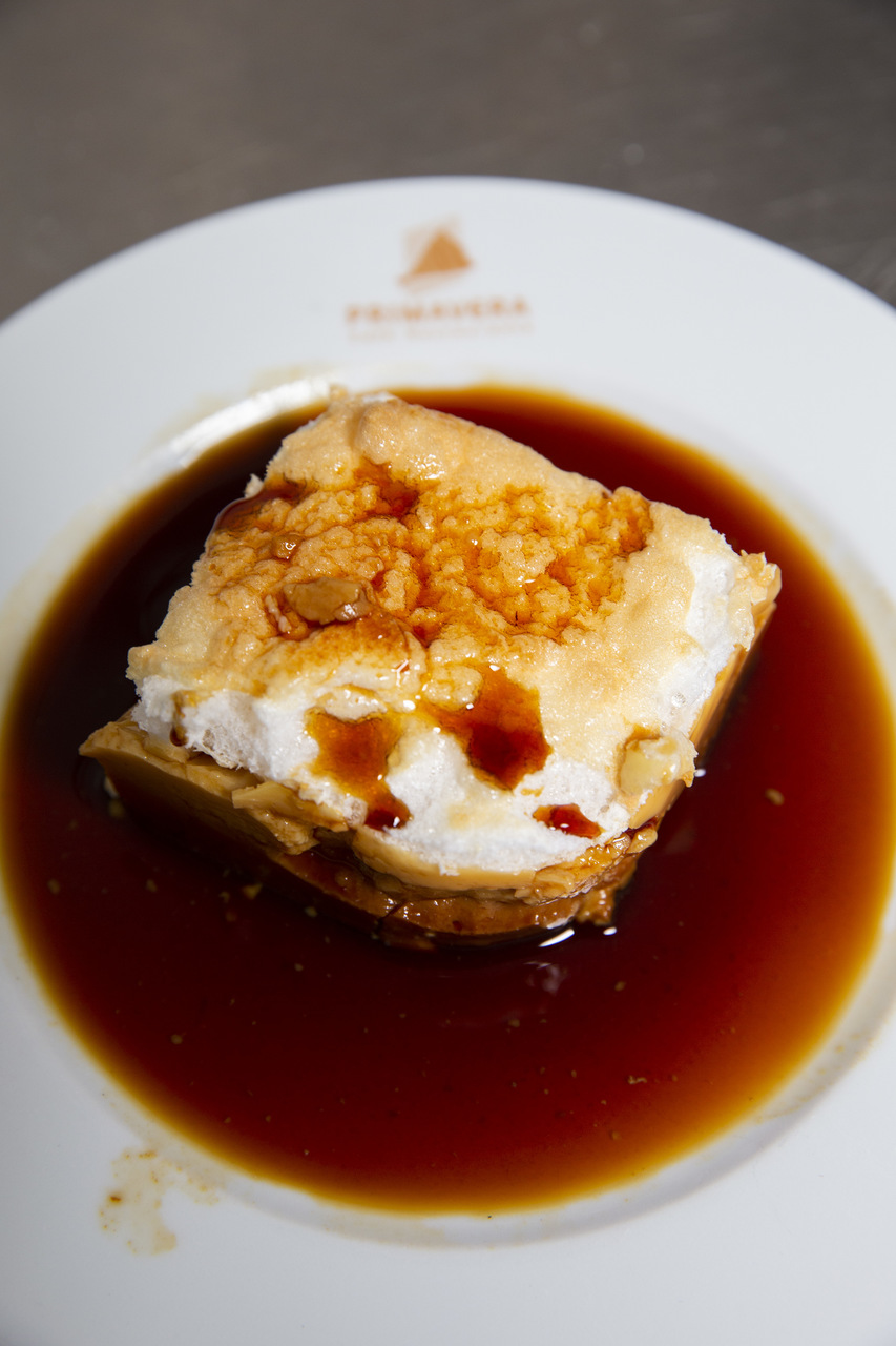 Leontina tem a memória fresca. Junto ao forno, recorda os primeiros tempos de funcionamento do Primavera, como mercearia, café e casa de pasto – um comércio como não havia outro na aldeia. “Assávamos frangos e fazíamos uns petiscos”, recorda, acrescentando que só mais tarde vieram as carnes e o bacalhau. No início, cozinhavam ela e o falecido marido. Hoje, o negócio, com alvará de 1965, continua a ocupar diferentes gerações da família. Enquanto João faz chegar as travessas aos clientes, a cozinha está entregue aos pais, Silvino e Maria Odília – foi esta última quem criou o doce da casa, uma espécie de pudim com uma camada de merengue cujo segredo não revela. “Quem prova quer sempre”, limita-se a dizer.