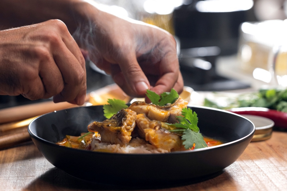 Para o refogado, comece por cortar em juliana meia cebola, meio pimento vermelho e meio pimento verde. Laminar três dentes de alho e cortar dois tomates, tirando a pele e as sementes. Ralar uma colher de sopa de gengibre. Laminar uma malagueta e retirar as sementes. Abrir uma vagem de erva-príncipe e picar talos de coentros. A um tacho quente, adicionar duas colheres de sopa de azeite, uma colher de sopa de óleo dendê e juntar todos os legumes cortados, à exceção do tomate. Temperar com sal e refogar de oito a dez minutos em lume brando. Dez minutos depois, juntar ao refogado 25ml de vinho branco, quatro colheres de sopa de polpa de tomate, 100ml de caldo de peixe e 100ml de leite de coco. Tapar e deixar apurar 15 minutos. De seguida, adicionar o peixe cortado em pedaços, com pele e temperado com flor de sal e sumo de limão q.b. e adicionar o tomate. Tapar novamente e em lume baixo e deixar mais dez minutos. Empratar colocando arroz cozido no centro do prato com a ajuda de um aro e, de seguida, colocar o molho do refogado à volta. Retirar o molde, colocar o peixe e adicionar mais molho. Temperar com umas folhas de coentros.