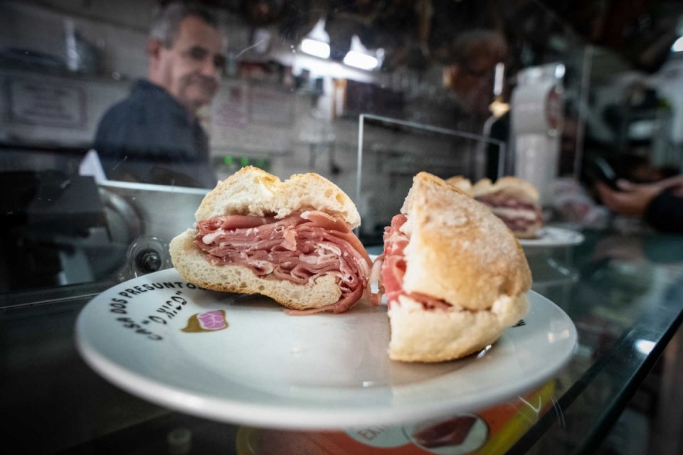 O presunto é cortado fino, numa máquina de fatiar que se encontra num canto atrás do balcão. A decorá-lo, no teto de telhas, estão muitas pernas de presunto, canecas de barro e uma guitarra de fado. Uma panóplia que serve de cenário à degustação dos petiscos habituais.