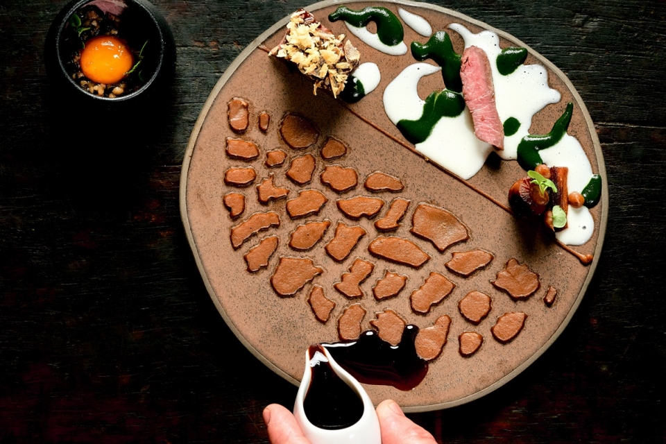 Os sabores de Natal seguem caminho com a canja de polvo que também leva galinha e poejo para lhe dar frescura; e com a dourada do mar cozinhada a vapor, “um produto top que está na sua melhor época”, que acompanha com samos de bacalhau e grão-de-bico. No leque de carnes, serve-se à mesa o peru biológico da Quinta da Coitena, assado a baixa temperatura, com castanhas assadas, chalotas caramelizadas e um toque de topinambur e azedas; e o borrego alentejano da Herdade de São Luís, Portalegre, onde se pratica agricultura regenerativa, e que aqui acompanha com cuscos transmontanos e cogumelos selvagens.