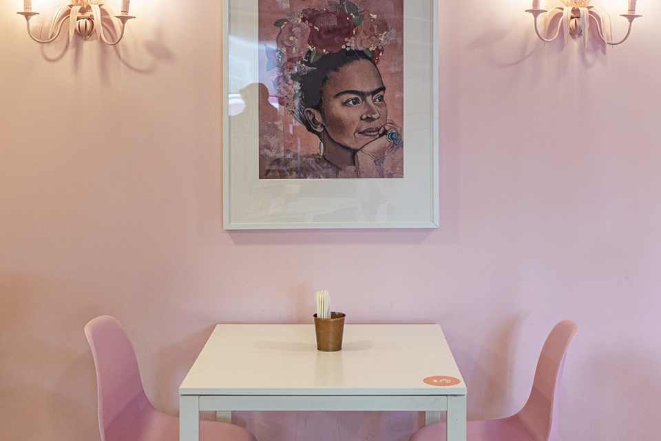 A Hello, Miss Frida! ocupa dois andares, decorados em tons de rosa, com imagens e outros objetos alusivos a Kahlo. Carla esclarece que não se trata de um museu nem de uma exposição sobre a artista, ainda que haja pessoas “de vários pontos do país” a dirigir-se ali para conhecer a casa. Acima de tudo, desejava que fosse “ousada, criativa e a desafiar estereótipos”, à semelhança da pintora que tanto a apaixona. “Quisemos ser qualquer coisa fora da caixa”, reforça Emanuel. A opção pelo rosa (que se estende das paredes aos talheres) é exemplo disso, nota. Fugiram às cores berrantes, associadas ao México.