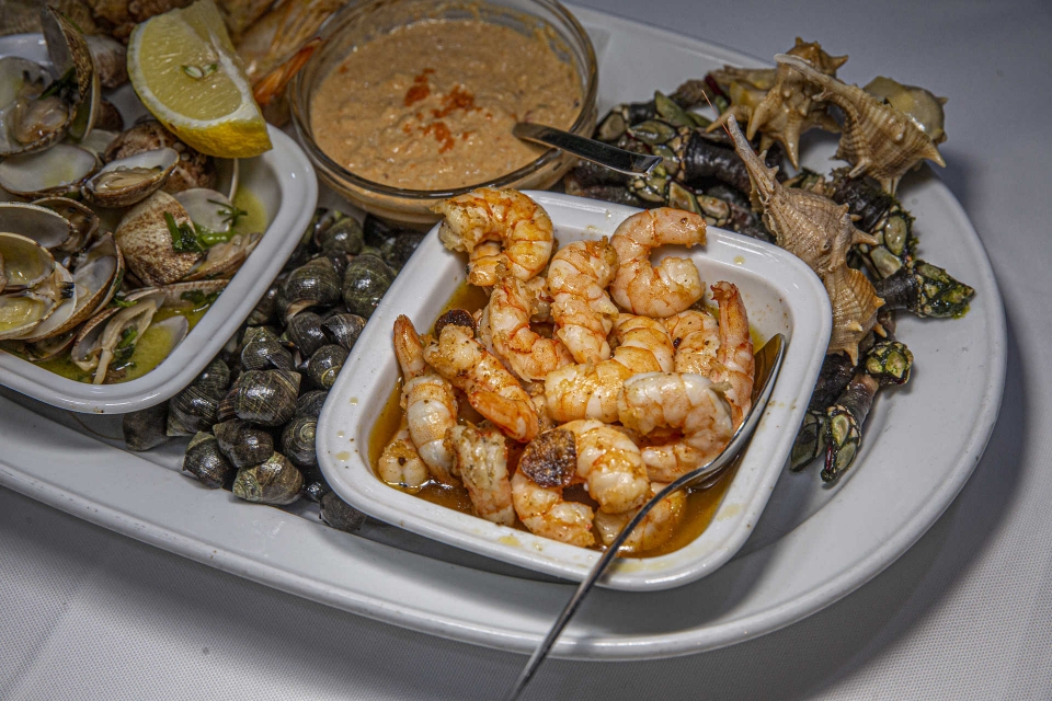 Há quem escolha o marisco vendido ao quilo, mas a maioria vai para uma das várias mariscadas. Numa delas é possível dividir por duas pessoas (28,50 euros por adulto) sapateira recheada, gambas cozidas e fritas, búzios, burriés, gambas al ajillo, berbigão, gambinhas, mexilhão, açorda de gambas e amêijoas à Bulhão Pato. Na mariscada especial (39 euros por adulto), a composição repete-se, mas traz também percebes, ostras, navalheiras, lagosta ou lavagante.