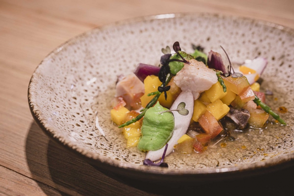 Em ano de escassa aparição do peixe protagonista, de acordo com Pedro Poças Pintão, o sável faz a primeira aparição no almoço a bordo de um aguacile, rodeado de cebola intensa, óleo de malagueta com efeito ao retardador, manga e puré de abacate. Magnificamente ácido. No copo, Poças Reserva Branco 2021.