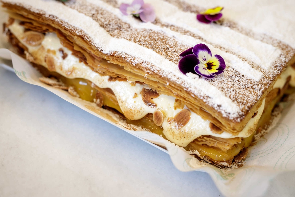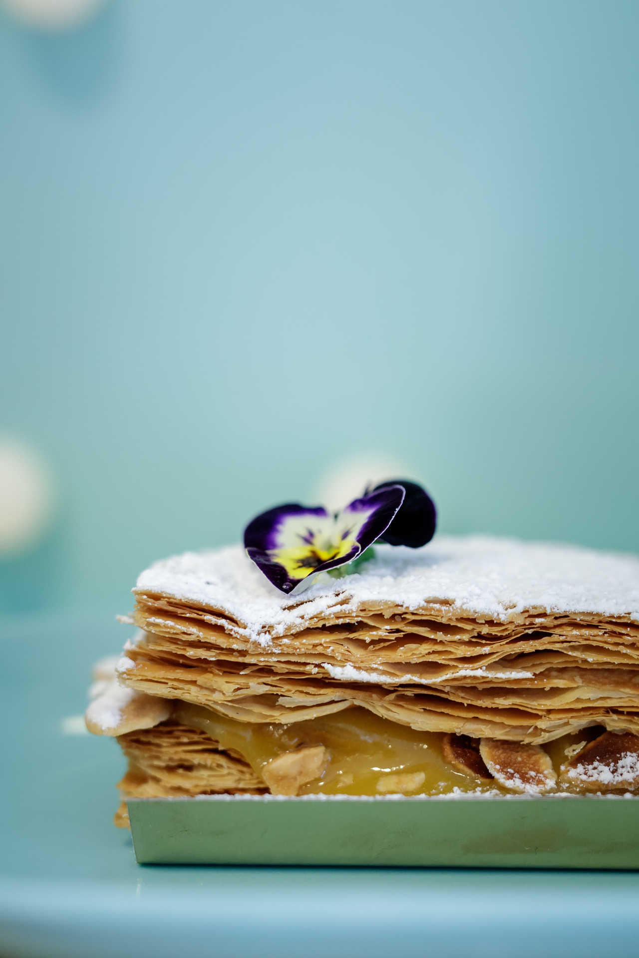 O mil-folhas conventual, com uma camada de doce de ovos moles e outra de creme fofo de ovos (mais leve e menos doce) com amêndoas laminadas torradas, é um dos best sellers da Puff Pastry Lovers. Foi a primeira combinação de sabores aperfeiçoada por Cláudia Silva, mas depressa se juntaram outras ao portefólio. Além do clássico, com recheio de creme de pasteleiro abaunilhado, existe ainda o silvestre – inspirado no seu bolo de casamento -, que leva doce de ovos moles, creme mascarpone e frutos vermelhos; o de mousse de chocolate belga e frutos vermelhos; e o contemporâneo, com duas camadas de cream cheese, raspas de lima e caramelo salgado. Mas na verdade, os recheios e coberturas podem ser combinados ao gosto do cliente.