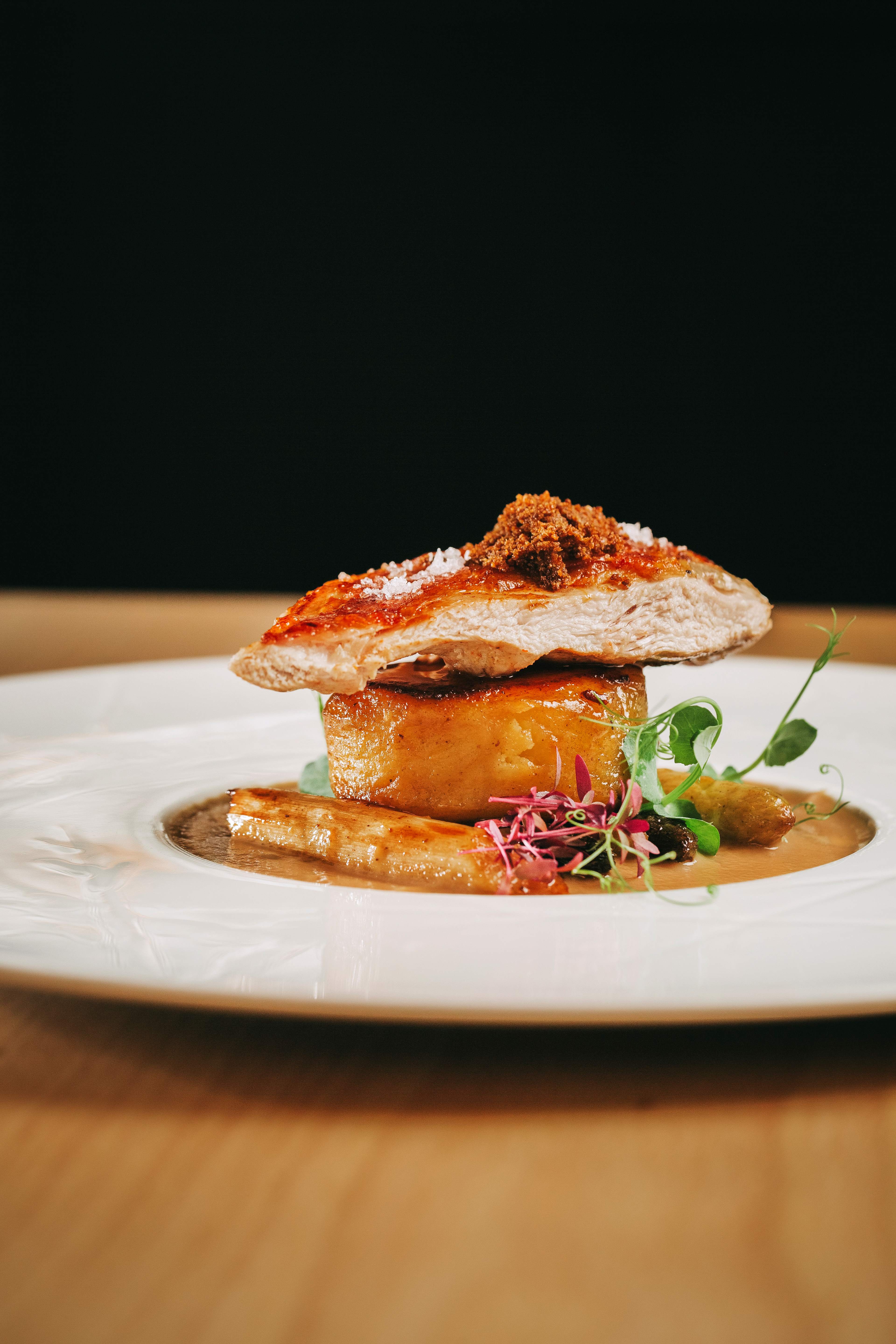 Após um limpa palato que desvenda virtudes na combinação de sorvete de tangerina com molho de malagueta, eis a carne: supremo de pintada isto é, galinha-d’angola, que na boca assemelha-se a porco), puré de tupinambo isto é, girassol-batateiro), batata cozinhada na gordura da pintada e espargos braseados, molho espesso e adocicado. A sugestão de vinho vem do Alentejo: Howard’s Folly Sonhador tinto 2018.