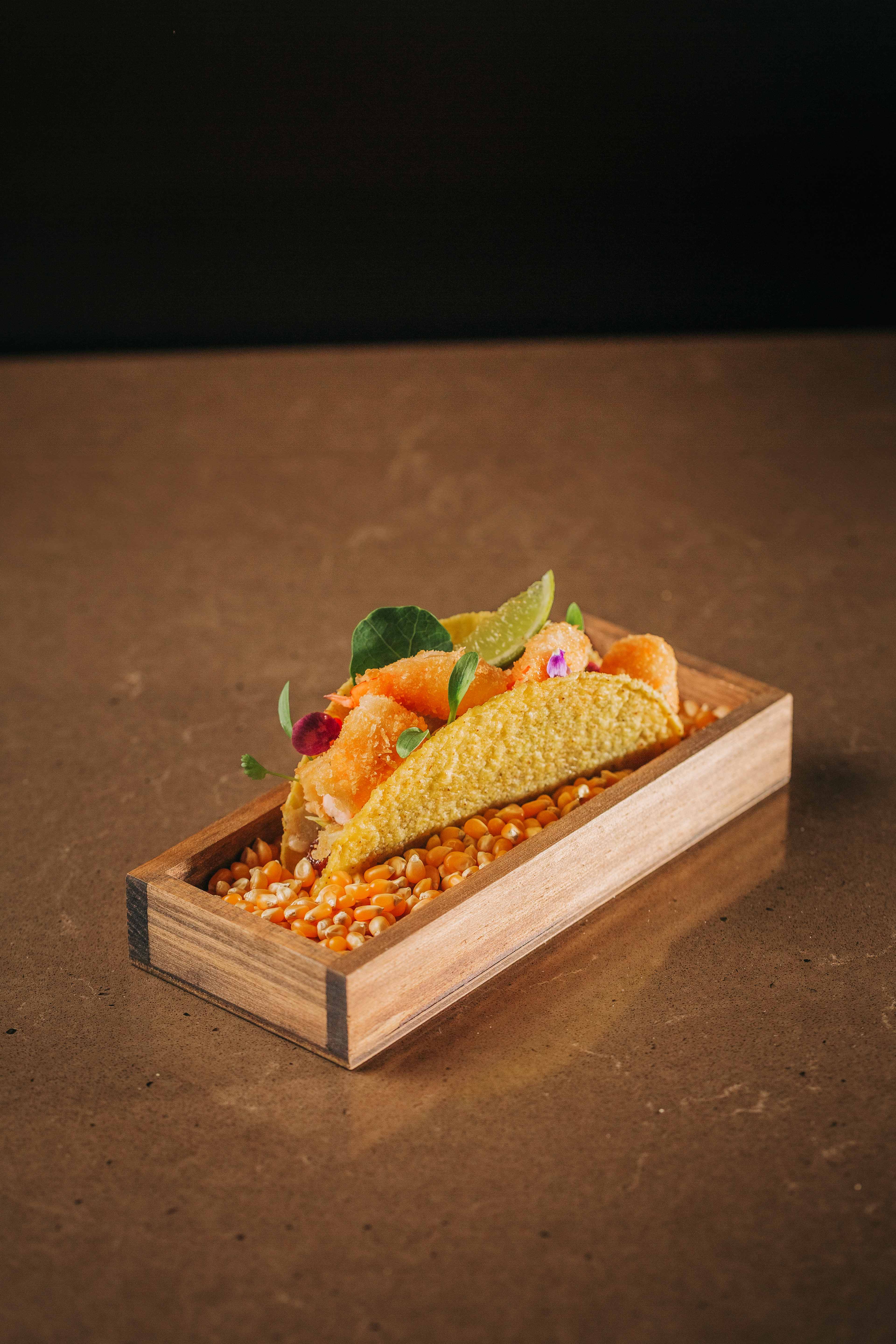 Outra entrada, crocante de milho, camarão e banana da Madeira, resulta de “viagens e experiências” do chefe. E resulta: é-se presenteado com um taco em que a banana e o molho de malagueta são peças essenciais. No vinho, com o Adega Mãe Riesling branco, recua-se a 2019.