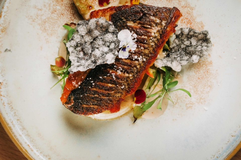 A carta, preparada ao longo de dois meses, é bem concretizada desde o arranque, que pode envolver robalo, manga e toranja. Deles extrai-se algo parecido com ceviche, “com aromas portugueses”. Sashimi de robalo (excelente), uma marinada de toranja, limão e coentros. A tapioca contribui com uma bem-vinda crocância e pretende aludir ao fundo do mar. Para o copo sugere-se Douro, um Casa Amarela rosé de 2022.