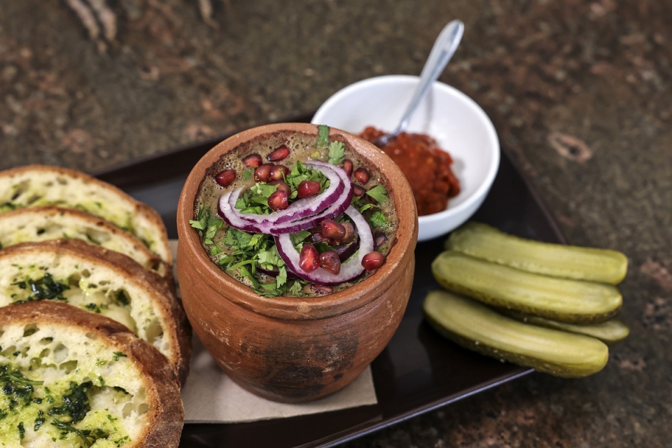 A tradicional sopa chikhirtma leva peru, ovo e limão; e nos principais há propostas como o shilaplavi (arroz) de borrego com estragão, vinho branco e queijo; o lobio (guisado de feijão com especiarias, bacon e legumes); e o pequeno frango inteiro (a que se chama de tsitsila) serve-se de duas formas, com molho de natas (versão shkmeruli) ou com molho de avelãs (chakhokhbili). Ao almoço, durante a semana, há menus executivos a 14 euros, com prato, salada e comida. A tradição deste país com o vinho não é descurada, com cinco referências vínicas georgianas para todos os palatos, do seco ao semi-doce.