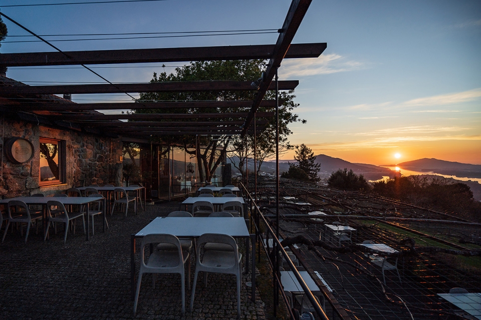 A casa tem uma sala com lareira e duas esplanadas em socalco, que funcionam o ano todo, onde se acomodam 170 pessoas. Havendo sol, enchem sempre essas mesas ao ar livre, com vista panorâmica sobre o rio Minho e as vinhas, assinala João.