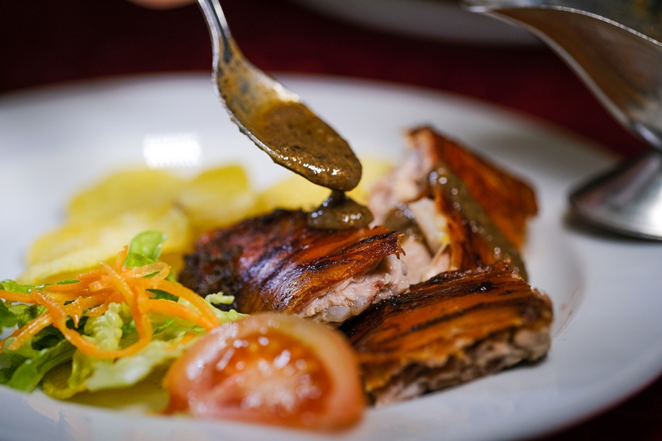 Passam poucos minutos do meio-dia quando os clientes começam a preencher as mesas do Dom Leitão, com cara de quem já espera o melhor. Para tudo estar a postos diariamente, a assadura da carne começa às nove e meia da manhã, prolongando-se por cerca de duas horas e meia. “Cada leitão é um leitão”, diz o gerente Marco Gomes, o que significa que uns precisam de mais tempo do que outros para ganhar a tal pele dourada e estaladiça. “É a melhor parte”, considera.