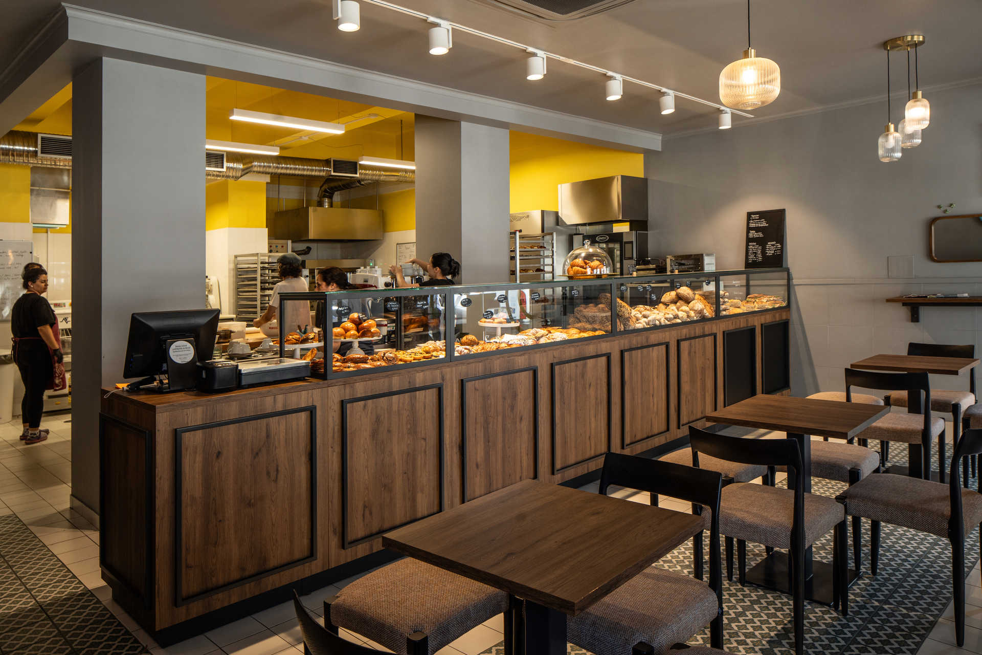 O chef de padaria e pastelaria é o argentino Luis Maidana, e os clientes mais curiosos podem ver como ganham forma pães e bolos, porque a área de produção é aberta. Numa primeira visita, vemos alguém alimentar a massa mãe de centeio (há também a de trigo) e assistimos à preparação de massas para a foccacia e o croissant francês.