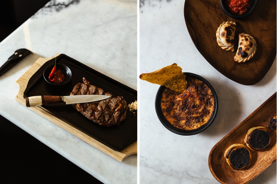 A inspiração nos sabores da Patagónia leva-nos para o entrecosto braseado de dupla cozedura, amaciado por seis horas em vinho Malbec – a casta tinta rainha na Argentina – e finalizado no Josper, acompanhado de legumes grelhados e pão de beterraba; mas também para os cogumelos da Patagónia com redução de frutos vermelhos. A tradição andina e a aposta nos cereais sentem-se em entradas como a humita, o milho cremoso com queijo, açúcar negro e cominhos; ou o tamale recheado com carne ‘charquí gaúcho’, salgada e seca; ou na salada à base de quinoa. Na carta cabem ainda as clássicas empanadas de recheio generoso – dois à escolha, carne de vaca ou quinoa e milho; moelas crocantes com limão e emulsão de salsa; medalhões de morcela em massa folhada e cebola caramelizada; ou a tradicional provoleta, para os amantes de queijo fundido.