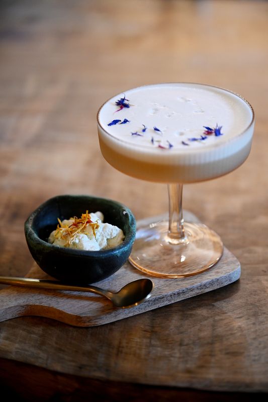 Interativa com quem está do outro lado do balcão – uma fatia de madeira de cedro com cinco metros de comprimento -, a experiência propõe várias harmonizações de queijos com bebidas destiladas e cocktails, como por exemplo a de comté com 24 meses de cura com fava tonka ralada e rum Zacapa. Outro dos pares sugeridos pelo bartender Lucas Queiroz é o cocktail Gemini (sumo de maçã, xarope de figo, yuzu, pimenta, casca de lima) com espuma de queijo azul fourme d’ambert DOP.