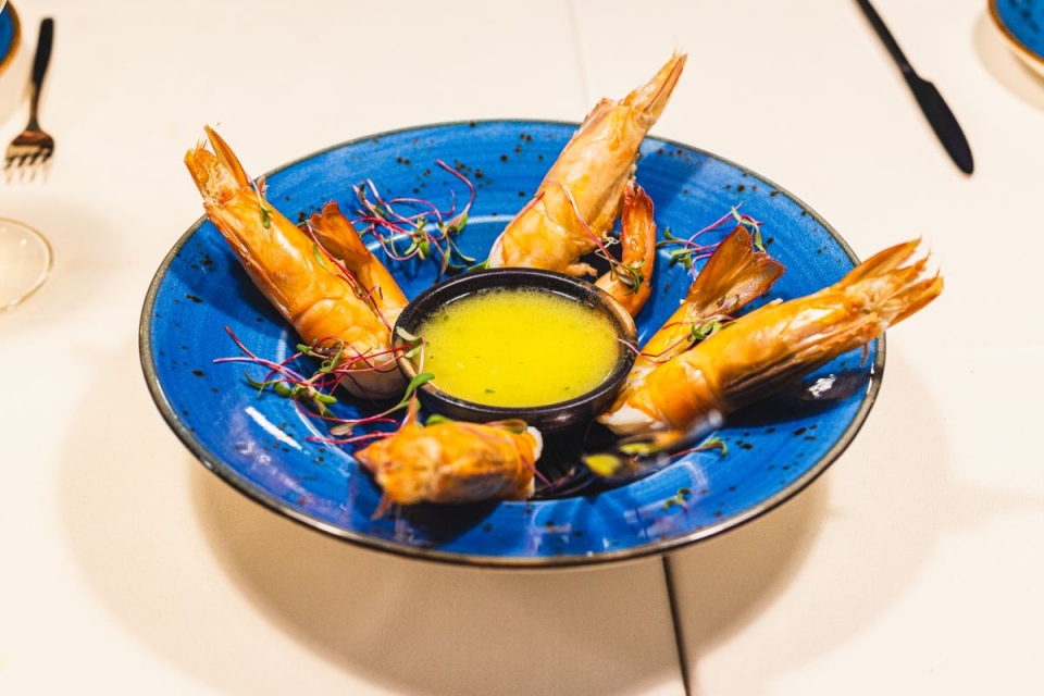As gambas são a estrela da companhia. “Só trabalho com gambas selvagens 20-30, de Madagáscar”, explica o chef ítalo-brasileiro de 46 anos. Na sua principal versão, são cozidas em água temperada com vinho branco, molho de peixe, molho de ostra, mirim e outras especiarias e servidas com manteiga de alho, ervas e tequila. “Para mim, a manteiga é vida”, brinca o profissional que já está em Portugal há uma década.