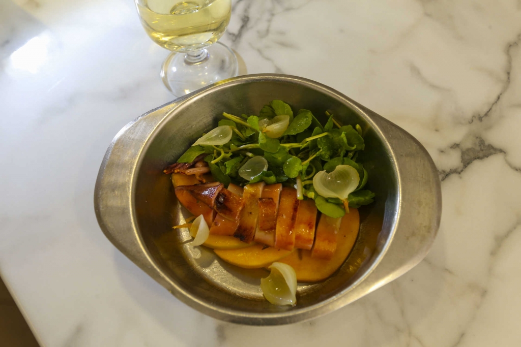 A chegada do outono trouxe, entretanto, novos produtos e inspirações a Afonso no que toca aos pratos da carta fixa, muito pedidos ao jantar (de quarta a sábado). É o caso do coelho à Tosco, que aqui surge acompanhado de pera bêbeda e uma fatia de pão frito em manteiga; e da salada de lulas grelhadas a baixa temperatura com diospiro (fruta da época), pickle de cebola pérola e agrião, que figura nos petiscos.
