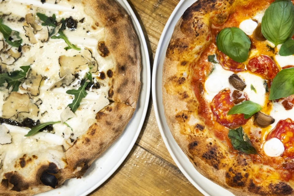 Tanto as pastas como os risotos estão disponíveis nos tamanhos pequeno e grande, para facilitar a partilha. Já as pizas – com massa de fermentação lenta, entre 24 e 48 horas – são feitas pelo pizzaiolo Victor Masseran. Entre as mais pedidas estão a picante Diavola, com pepperoni, e a de quatro queijos e trufa. Neste e noutros pratos, a trufa pode ser reforçada a pedido do cliente, laminada diante dele a troco de 5,5 euros por grama. E o rebordo das pizas mergulhado em molho pesto, disponível em três versões: pimentos, pistacho ou manjericão roxo.