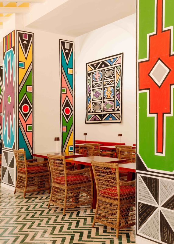 Inquilino deste espaço há quase três anos, o restaurante Cavalariça Évora (que é o segundo, após a abertura na aldeia da Comporta, em Alcácer do Sal, em 2017, e o espaço temporário na Rua da Boavista, em Lisboa, entretanto convertido em Cav86) contou com uma remodelação assinada pelo designer Jacques Grange. Tanto ele como Benech trabalharam a partir dos painéis da artista sul-africana Esther Mahlangu, com formas geométricas e coloridas, tribais.