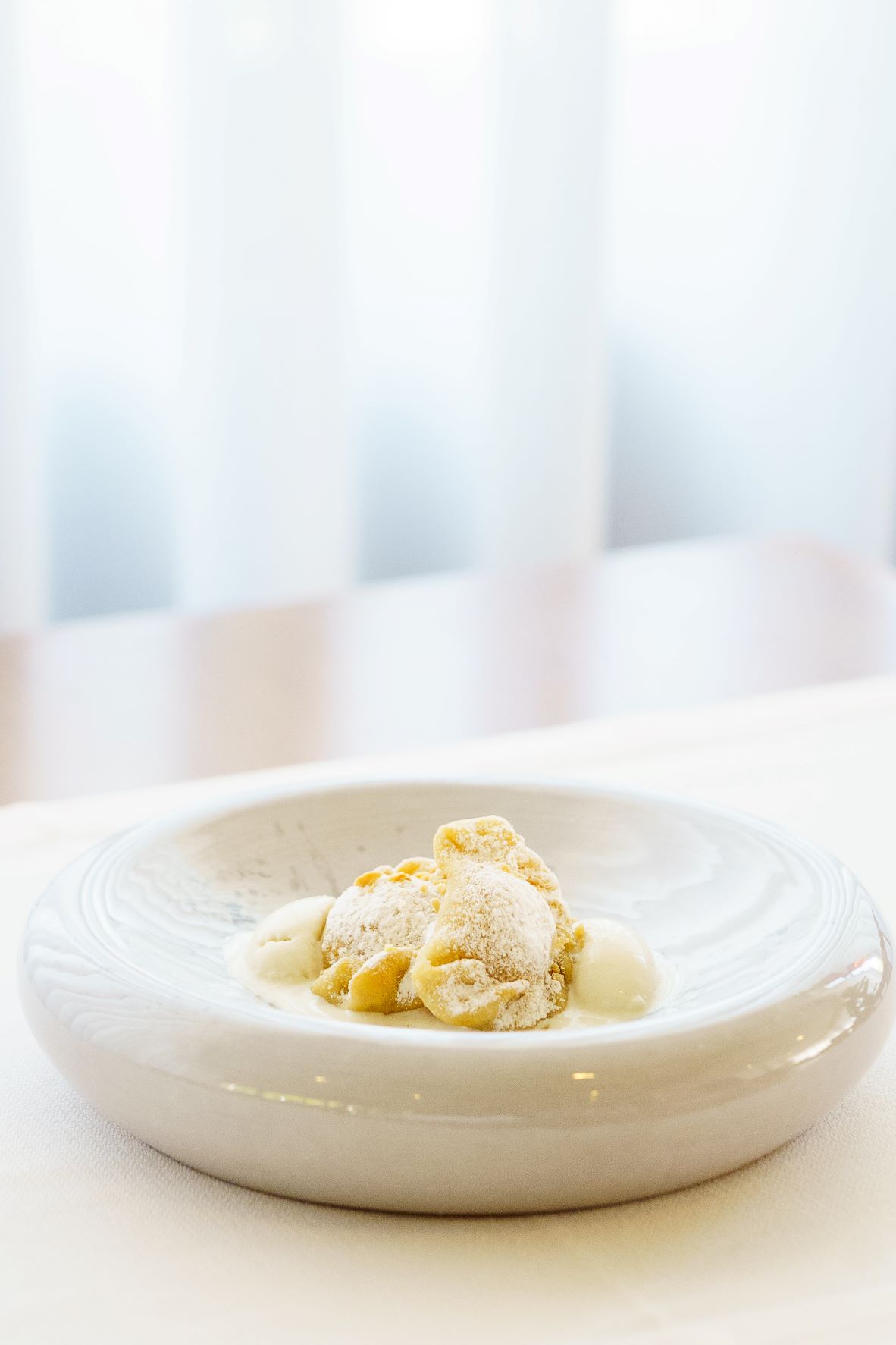 Outro exemplo do máximo aproveitamento de matérias-primas é o suave gelado de sementes de abóbora que acompanha as Meias Luas à Louro. Esta reinterpretação de um doce conventual de Viana do Castelo é recheada com fios de abóbora e creme de amêndoa.