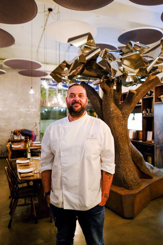 Hugo Bernardo, de 42 anos e natural do Estoril, teve vários restaurantes próprios e passou por alguns outros antes de se fixar em Santa Vitória do Ameixial, próximo da qualidade de vida proporcionada pelo Alentejo. No The Folly, é um embaixador dos produtos da região, a começar pelos enchidos e carnes de fumeiro da Salsicharia Canense, em Sousel, cujo saber fazer de gerações é liderado por Octávia Rebelo. Dela traz cabeça de xara (porco), que serve com cebola roxa caramelizada e tostas.