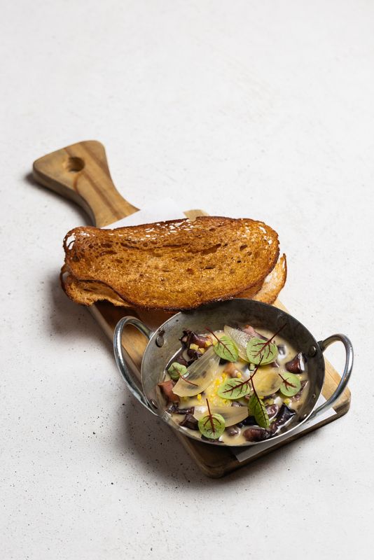 Rica em gordura, salinidade e capaz de ganhar uma textura ótima “quando cozinhada no ponto certo”, a sardinha braseada surge combinada com pimento assado, brioche e “foie do mar”, isto é, um fígado de tamboril cremoso, descreve a chef. O poejo assume a função de “equilibrar a potência de sabores com a sua frescura, ajudando a descansar o palato”. Neste momento, a entrada quente é um dos pratos com mais procura, mas entraram também uma mini-sanduíche de rosbife, cebola, rúcula e beterraba e o pica-pau de percebes com limão e manteiga noisette.