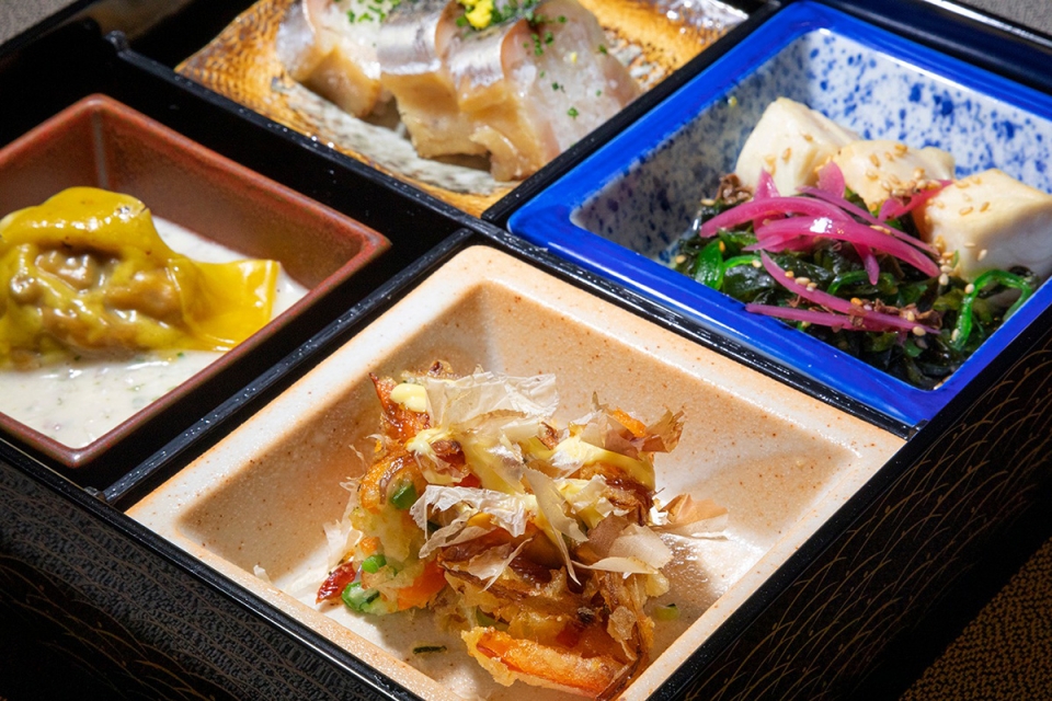 No dia em que a Evasões visitou o espaço, foram sugeridos como aperitivos da degustação croquete de maguro (atum bluefin) com katsuobushi e maionese picante; pickles japoneses e mexilhão gratinado com molho hollandaise, assim como beringela com molho miso. Do menu constam, entre outros, ussuzukuri de peixe branco com molho ponzu;