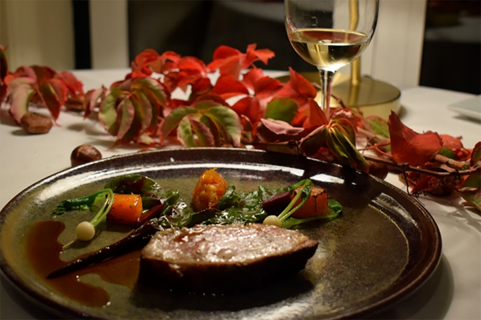 O ponto alto do menu, para os amantes de carne, é a presa ibérica fumada durante 12 horas e apresentada com uma fatia de papada, texturas de abóbora, nabo laminado, couve kalel, molho demi glace de pimenta preta e pimenta szechuan. Já a pré-sobremesa é um hino ao outono, apresentando diospiro em diferentes texturas com um crocante de laranja e canela. A segunda sobremesa conjuga castanha, chocolate 70%, jeropiga e avelã.