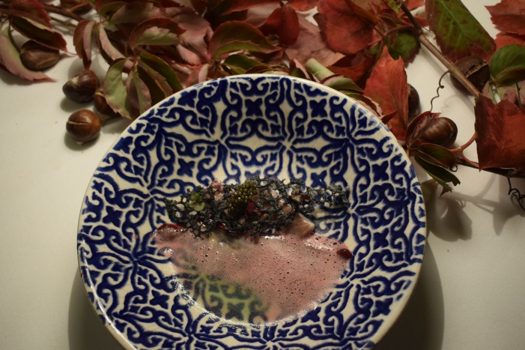 Seguindo um pouco a rota das especiarias e as incursões dos portugueses por territórios desconhecidos, Luís Calixto propõe, como entrada, enguia (fumada durante meia-hora em madeira de bétula) com textura de choco (a lembrar uma rede de pesca), caviar, puré de beterraba e coulis de maçã e pepino. Esta é a primeira de várias propostas em que a técnica do fumo serve o sabor e a textura do produto, muito valorizados pelo chef.