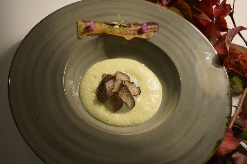 A tríade de pratos principais é um mergulho no mar e uma ida a terra. Começa com peixe do mar (corvina é um deles) cozinhado ao vapor e servido com berbigão, puré de batata doce, courgette salteada, confit de limão, alface do mar, salicórnia e infusão de lúcia-lima. Depois, segue para ovo biológico cozido a baixa temperatura com espuma de batata com aroma de foie, trufa de inverno, barriga de porco desfiada com puré de alho e flores do mesmo.