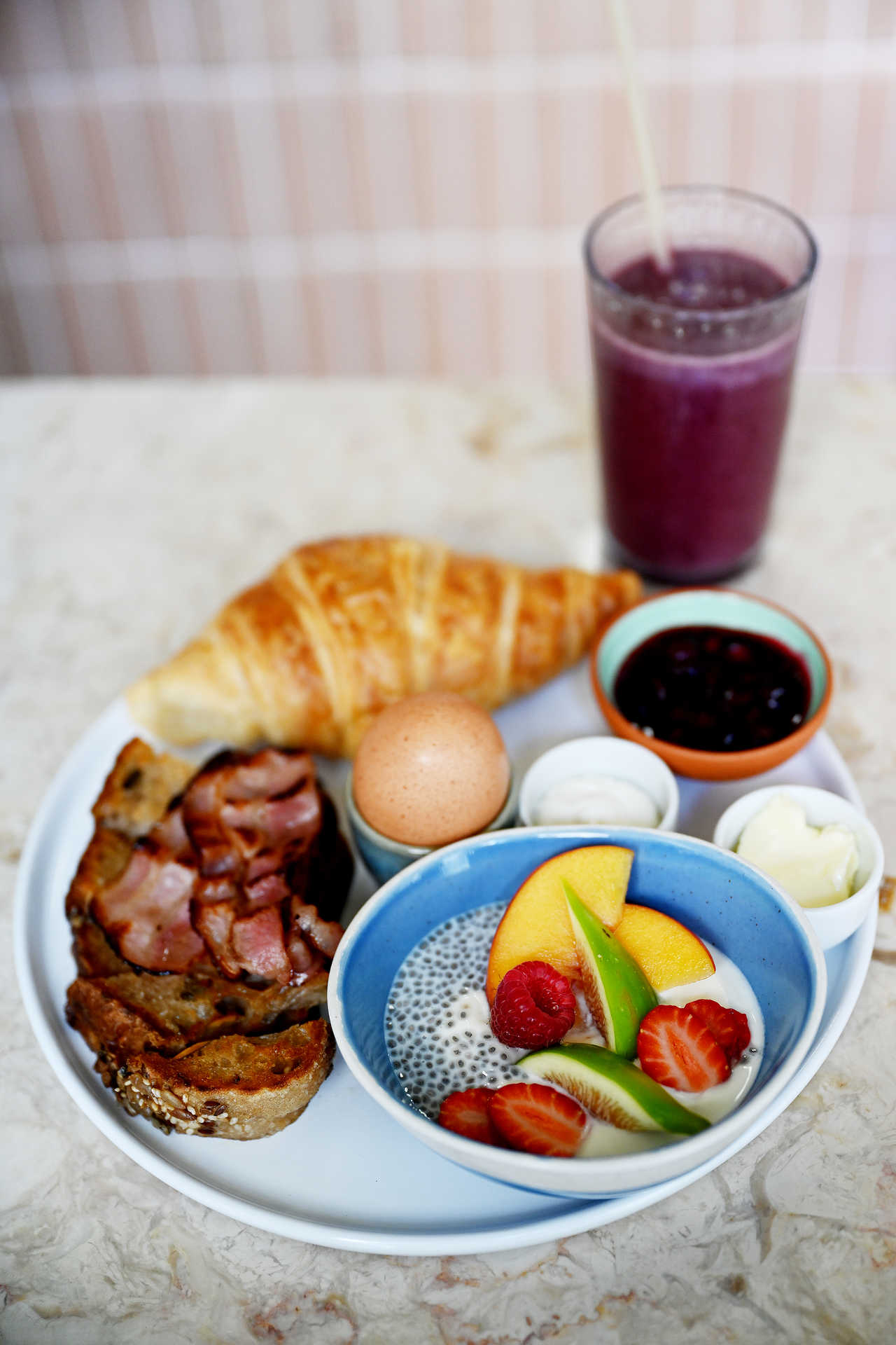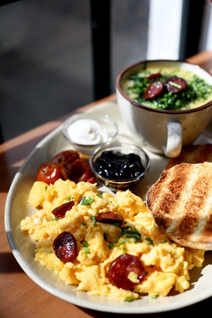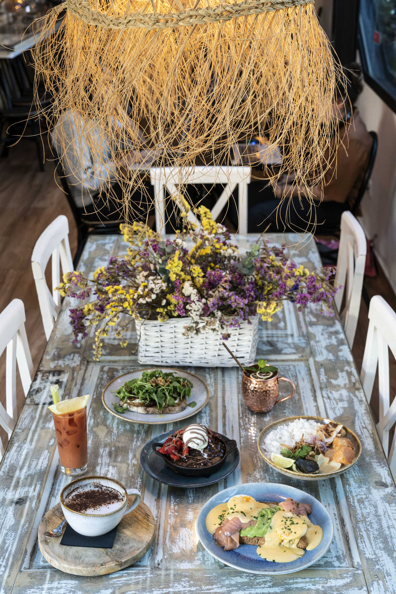 A ementa, a cargo do chef Ivo Polónia, inclui entradas e petiscos, ovos, saladas e taças, tostas, sanduíches, hambúrgueres, doces e panquecas. Estas últimas, que mais parecem um bolo e também vão ao forno, são servidas em frigideiras de ferro. Recentemente, foram introduzidos pratos como o caril thai amarelo com leite de coco, feito com especiarias frescas, e que na versão vegana leva pak choi, mini milho e batata doce. Tudo prima pela fotogenia, incluindo as bebidas, que vão do cappuccino aos cocktails. Na hora de escolher, diz Catarina, “muita gente vem com o Instagram na mão”.