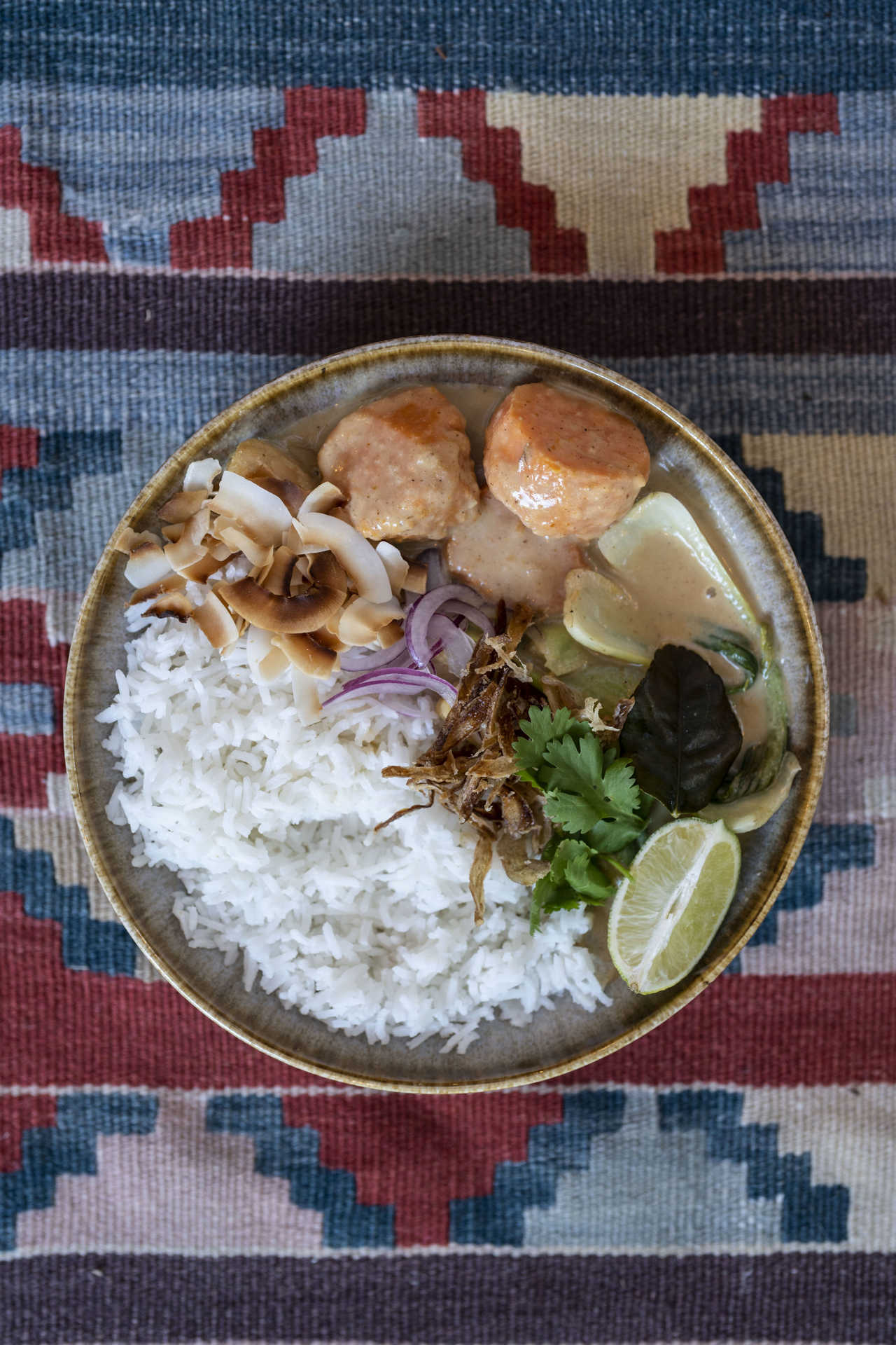 - A decoração acusa influências de África e da América Latina. Ao lado, o caril vegano. (Fotografias de Maria João Gala/GI)